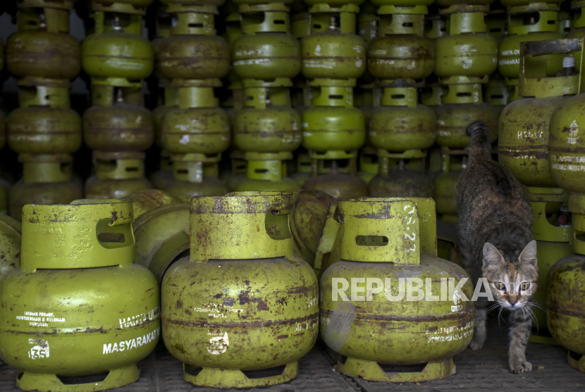 Seekor kucing berada di antara tabung gas liquefied petroleum gas (LPG) 3 kilogram di salah satu agen (ilustrasi). Pertamina Patra Niaga Regional Sumbagsel membentuk Satuan Tugas (Satgas) untuk memantau kelancaran penyaluran Bahan Bakar Minyak (BBM) di wilayah OKU Raya menjelang Ramadhan 1444 Hijriyah.