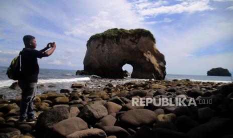 Seorang pengunjung mengabadikan keindahan Pantai Batu Balubang di Kelurahan Tomajiko, Pulau Hiri, Maluku Utara, Ahad (30/7/2023). (FOTO : ANTARA FOTO/ANDRI SAPUTRA)