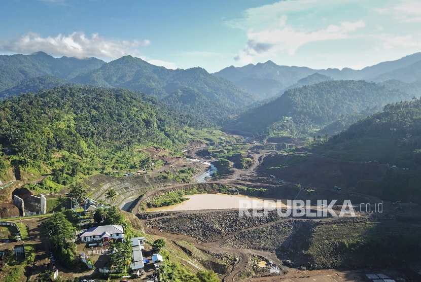 LalangBuana,LOMBOK BARAT — Foto udara proyek pembangunan Bendungan Meninting di Desa Bukit Tinggi, Kecamatan Gunungsari, Lombok Barat, NTB, Kamis (11/5/2023).
