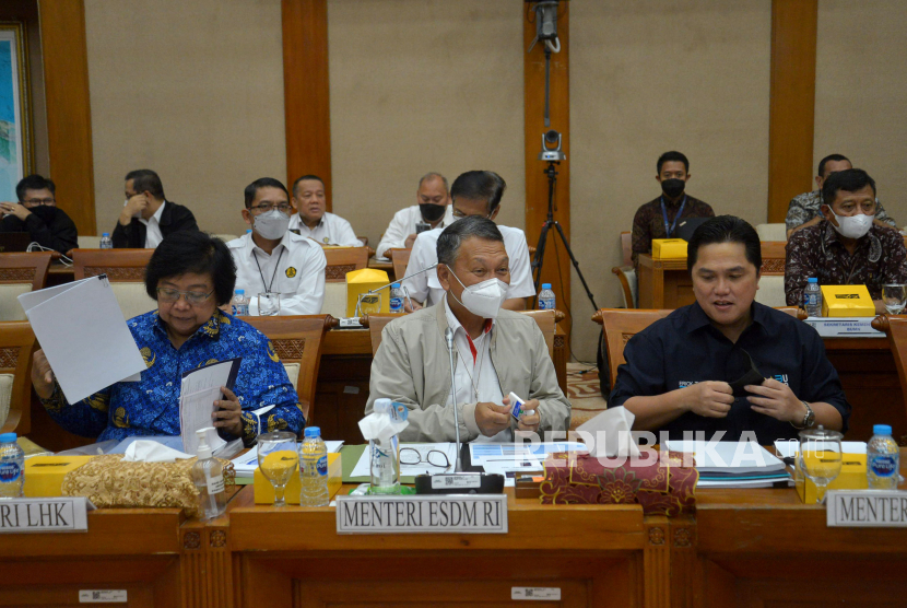 Menteri ESDM Arifin Tasrif (tengah), Menteri BUMN Erick Thohir (kanan) dan Menteri LHK Siti Nurbaya (kiri) bersiap mengikuti Rapat Kerja dengan Komisi VII di kompleks Parlemen Senayan, Jakarta, Selasa (29/11/2022). Raker tersebut beragendakan pengantar musyawarah mengenai Rancangan Undang-Undang Energi Baru dan Energi Terbarukan (RUU EB-ET). Republika/Prayogi