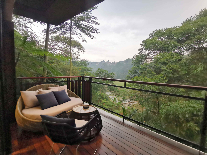 Selain itu, terdapat balkon dengan sofa dan meja yang pemandangannya menghadap kebun dan persawahan. Saat pagi hari, udara dingin cukup terasa dan semakin lengkap dengan pilihan berbagai minuman, seperti teh hingga alat nespresso untuk menyeduh kopi.