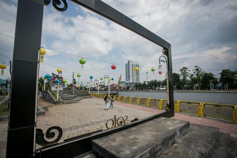 Seorang menikmati pemandangan di kawasan taman Bendung Tirtonadi, Solo, Jawa Tengah, Rabu (16/2/2022). Penataan taman…