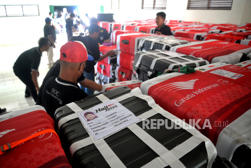 Petugas menyusun koper jamaah calon haji kloter 2 di Asrama Haji Donohudan, Boyolali, Jawa Tengah,…