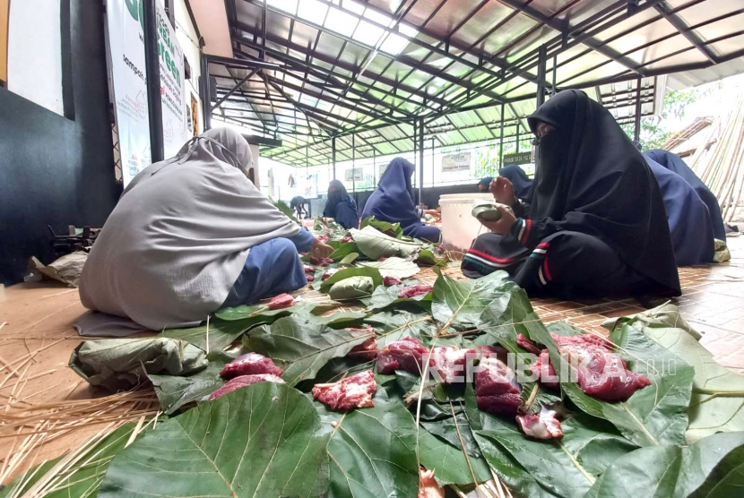 Sejumlah santri dibantu warga membungkus daging kurban dengan daun jati dan tali bambu di Pesantren…