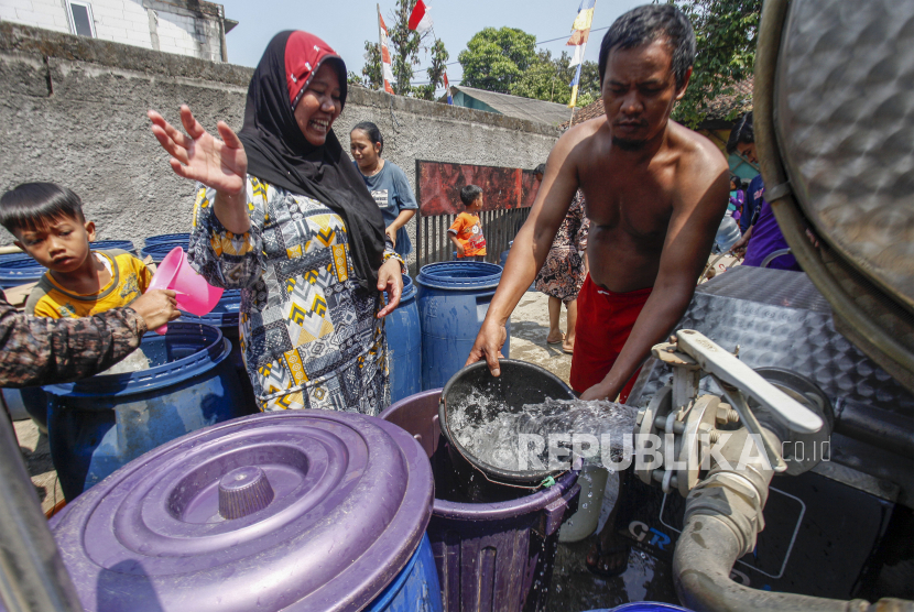 Warga mengambil air bersih yang disalurkan oleh Badan Penanggulangan Bencana Daerah (BPBD) di Desa Sukahati,…
