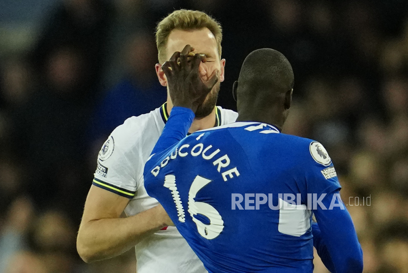 Pemain Tottenham Harry Kane didorong oleh pemain Everton Abdoulaye Doucoure pada pertandingan sepak bola Liga…