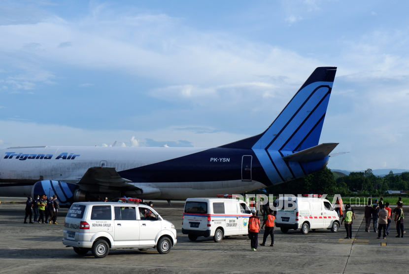 Sejumlah mobil ambulans mengangkut jenazah korban jatuhnya pesawat caravan PT Semuwa Aviasi Mandiri (SAM Air)…