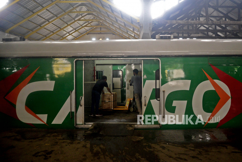 Pekerja memasukan boks berisi kiriman barang ke dalam gerbong kereta api di Stasiun Jakarta Gudang,…