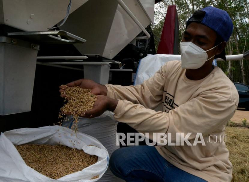 Petani menunjukkan hasil panen padi Gogo Rancah atau padi ladang saat panen perdana di Kabupaten…