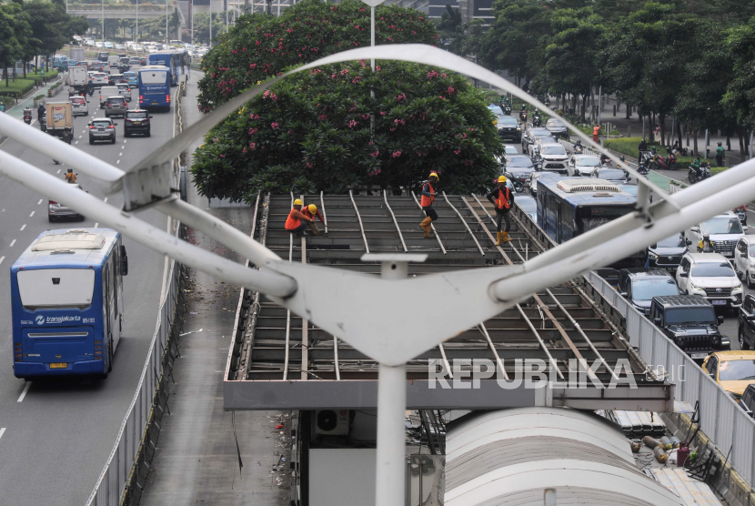 Sejumlah pekerja membongkar Halte Transjakarta Karet di Sudirman, Jakarta Pusat, Rabu (7/6/2023). Halte Karet beserta…