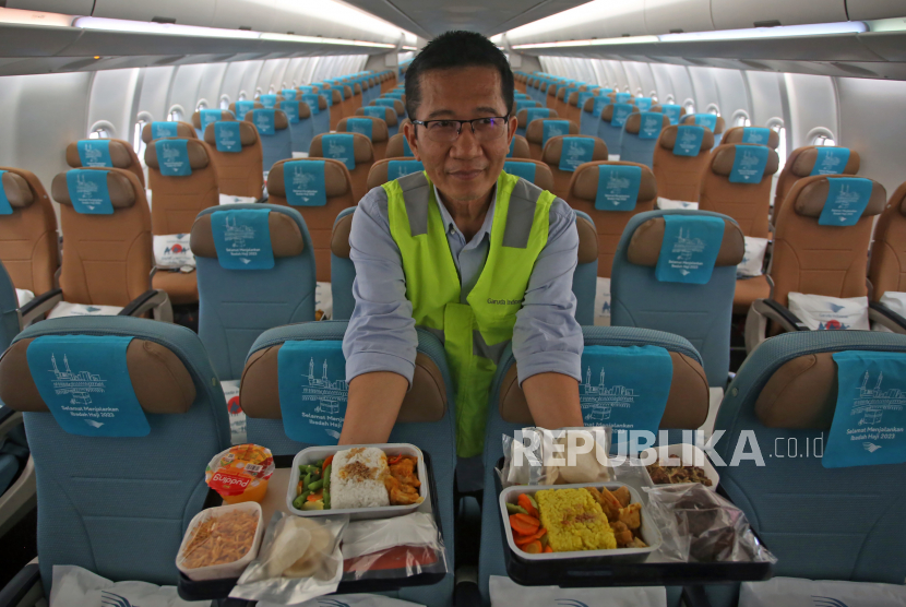 Pekerja Garuda Maintenance Facility (GMF) menunjukkan menu makan untuk jamaah selama penerbangan ke Tanah Suci…