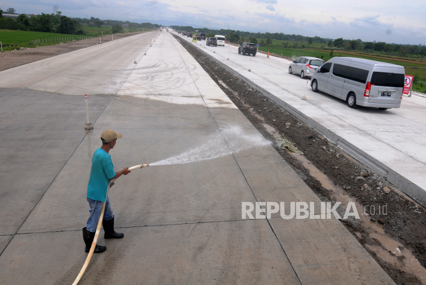 Pekerja menyemprotkan air pada jalan tol fungsional Solo-Yogyakarta di Banyudono, Boyolali, Jawa Tengah, Kamis (13/4/2023)….
