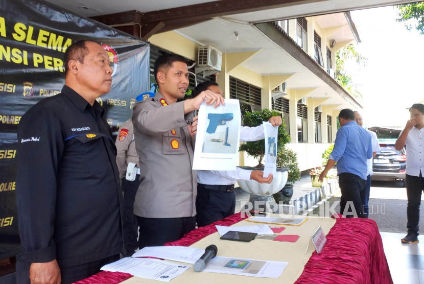 Kapolres Sleman AKBP Yuswanto Ardi menunjukan gambar senjata yang digunakan pelaku penembakan puskesmas Depok I,…