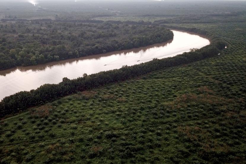 Foto udara lahan perkebunan kelapa sawit skala besar dan tanaman mangrove di kawasan penyangga Cagar…