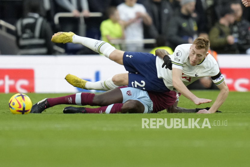 West Ham Michail Antonio (terbawah) berebut bola dengan pemain Tottenham Dejan Kulusevski pada pertandingan sepak…