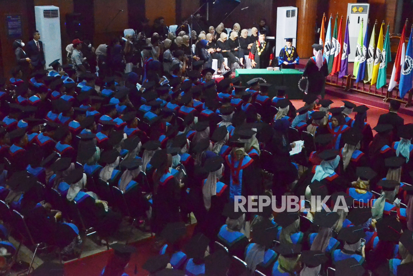 Rektor Unisba Prof Edi Setiadi memberikan ijazah dan tafsir Alquran kepada wisudawan saat wisuda Universitas…