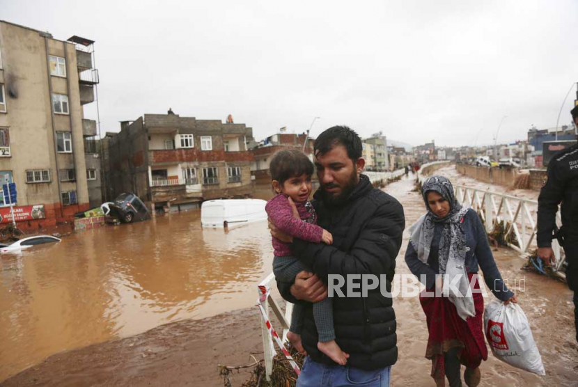 Warga berjalan meninggalkan tempat tinggalnya saat banjir setelah hujan lebat di Sanliurfa, Turki, Rabu, Rabu,…