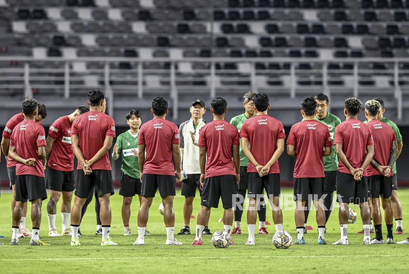 Pelatih Timnas sepak bola Indonesia Shin Tae-yong (tengah) memimpin jalannya latihan jelang pertandingan sepak bola persahabatan (FIFA Matchday) antara Timnas Indonesia melawan tim sepak bola Palestina di Stadion Gelora Bung Tomo, Surabaya, Jawa Timur, Selasa (13/6/2023). Timnas Indonesia akan melakukan pertandingan FIFA Matchday melawan tim sepak bola Palestina di Gelora Bung Tomo, Surabaya, Rabu (14/6/2023). ANTARA FOTO/Muhammad Adimaja/foc.