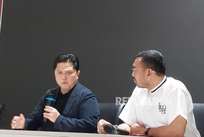Ketua Umum PSSI Erick Thohir dan Anggota Komite Eksekutif (Exco) PSSI Arya Sinulingga (kanan) di Kantor PSSI, GBK Arena, Jakarta, Rabu (19/4/2023).