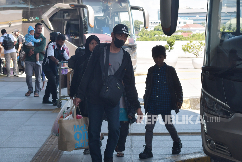 Sejumlah calon penumpang bersiap menaiki bus, di Terminal Terpadu Pulo Gebang, Jakarta Timur, Rabu (12/4/2023). Menurut data pengelola Terminal Pulo Gebang dari tanggal (7/4) 2.511 penumpang menggunakan 374 bus berangkat dari Terminal Terpadu Pulo Gebang untuk. mudik lebih awal. (FOTO : Antara/Fakhri Hermansyah)