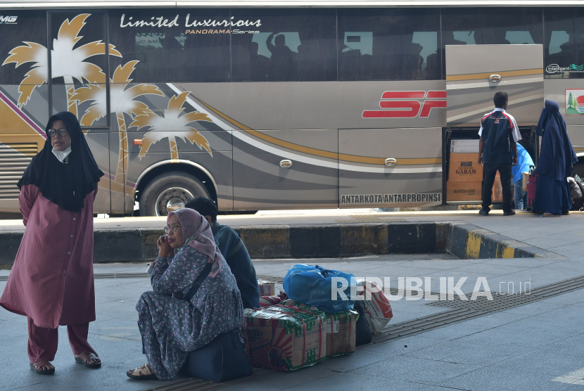 LalangBuana,JAKARTA — Sejumlah calon penumpang menunggu kedatangan bus di Terminal Terpadu Pulo Gebang, Jakarta Timur, Rabu (12/4/2023).