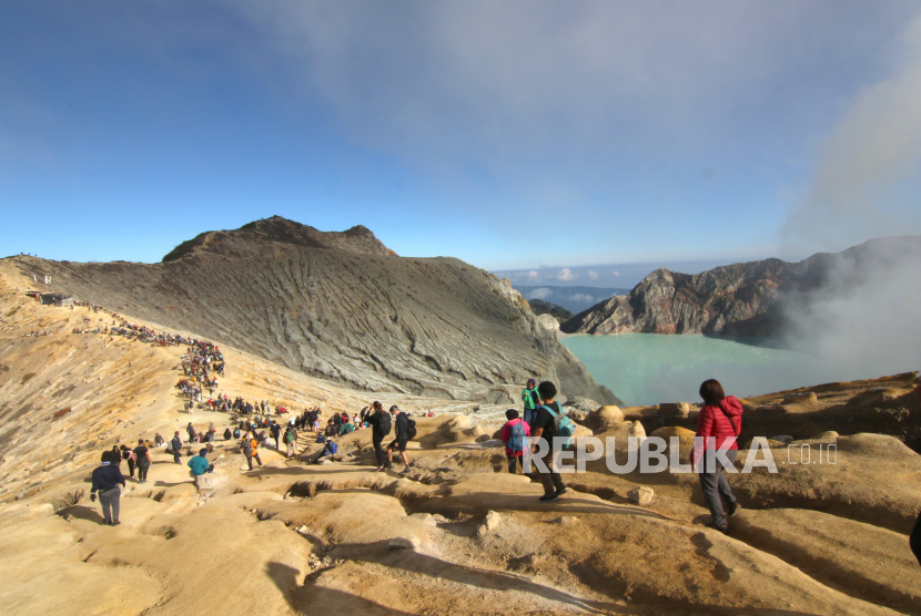 Para wisatawan berkunjung untuk melihat kawah dari kaldera Gunung Ijen. TWA Ijen telah ditetapkan sebagai anggota UNESCO Global Geopark (UGG).