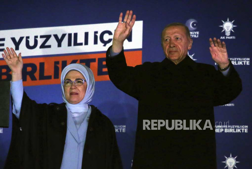Presiden Turki Recep Tayyip Erdogan (kanan) dan istrinya Emine memberi isyarat kepada para pendukungnya di markas partai, di Ankara, Turki, Senin dini hari, (15/5/2023). Erdogan yang telah memerintah negaranya dengan cengkeraman yang semakin kokoh selama 20 tahun, adalah terkunci dalam perlombaan pemilihan yang ketat pada hari Minggu, dengan kemungkinan menang atau kalah melawan penantang utamanya saat suara terakhir dihitung.