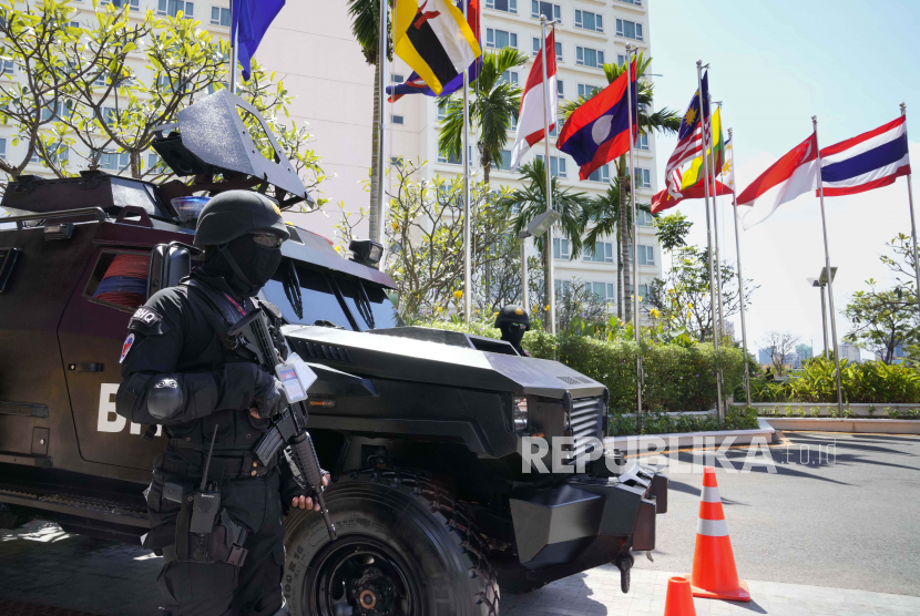 Anggota pasukan khusus berdiri di samping mobil bersenjata di luar tempat KTT Perhimpunan Bangsa-Bangsa Asia Tenggara (ASEAN).
