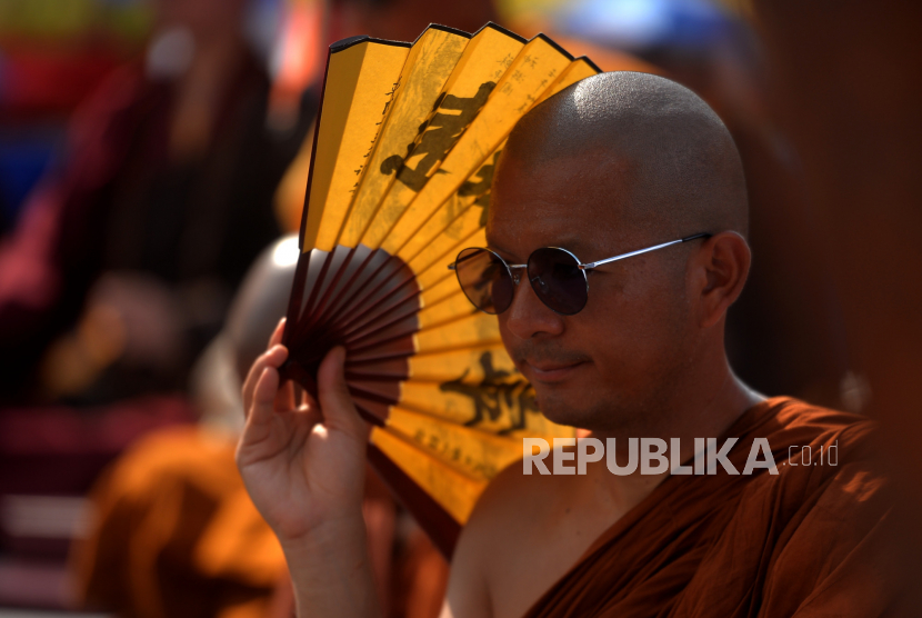 Bhiksu menahan paparan terik matahari dengan kipas saat perayaan Waisak 2567 BE di Candi Borobudur, Magelang, Jawa Tengah, Ahad (4/6/2023). (FOTO : Republika/Wihdan Hidayat)