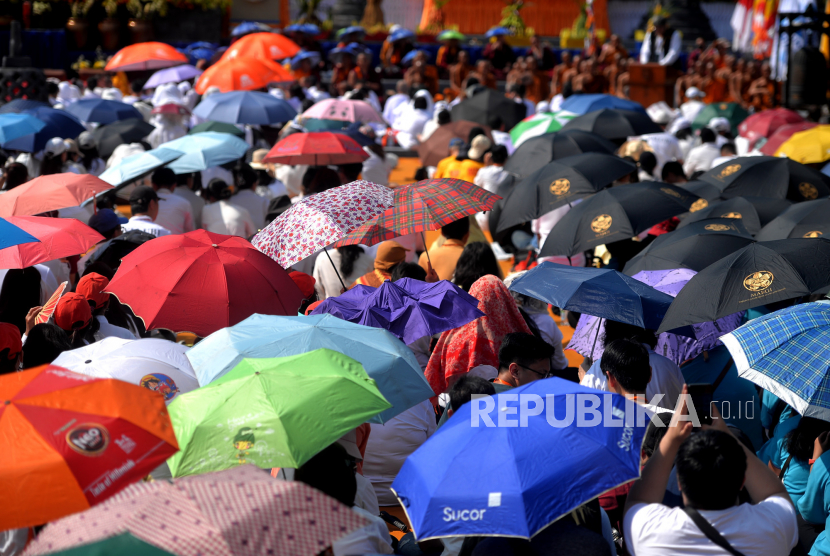 Umat Budha mengikuti acara perayaan Waisak 2567 BE di Candi Borobudur, Magelang, Jawa Tengah, Ahad (4/6/2023). (FOTO : Republika/Wihdan Hidayat)