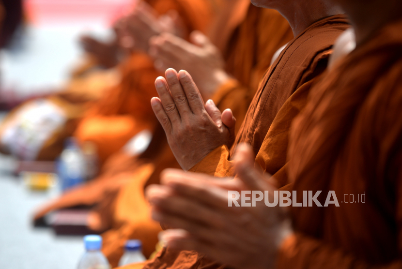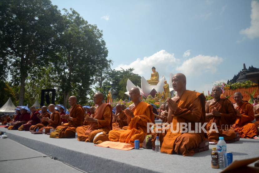 Bhiksu berdoa saat perayaan Waisak 2567 BE di Candi Borobudur, Magelang, Jawa Tengah, Ahad (4/6/2023). (FOTO : Republika/Wihdan Hidayat)
