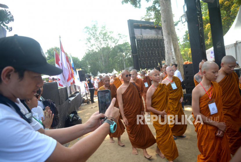 Umat Budha mengambil bhiksu yang akan menjalani ritual pradaksina saat perayaan Waisak 2567 BE di Candi Borobudur, Magelang. (FOTO : Republika/Wihdan Hidayat)